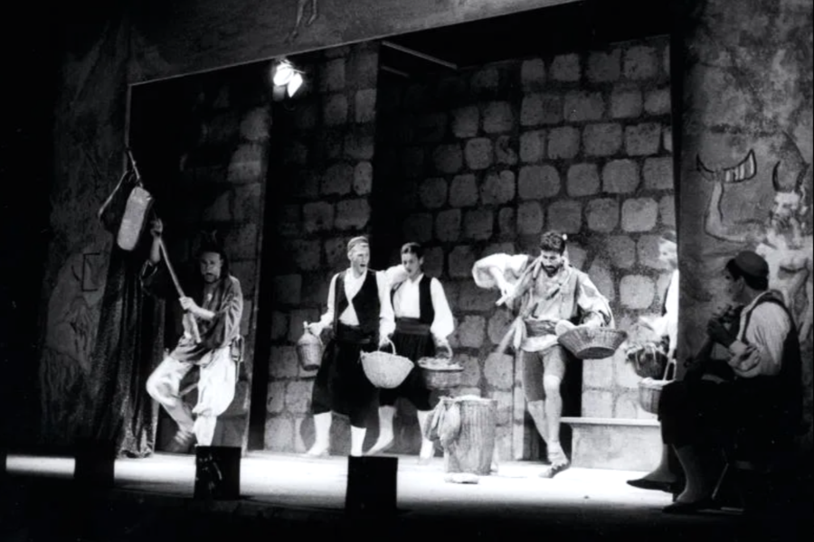 Godina na poleđini fotografije, 1967, savršena simetrična mizanscena majstora režije, prepoznavanje glavnih glumaca i prostora izvedbe otkriva da je riječ o prizoru iz legendarne predstave, jedne od stupova Dubrovačkih ljetnih igara – Držićeve komedije Skup, koja se u takvoj postavi i u režiji Koste Spaića održala do 1971. godine ...pročitajte cijeli tekst...