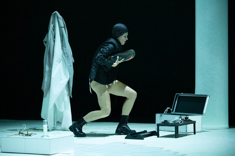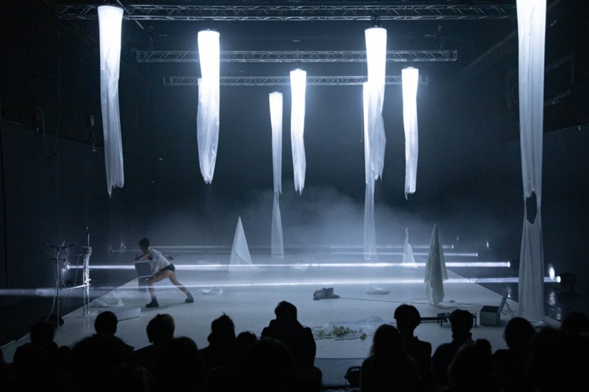 Želatinoznu masu koju nosi kao dijete ili vrijednu relikviju plesačica uništava tijelom, rasprskuje gledateljima pod nogama, uključujući ih u imaginativnu kompoziciju. Izvođačica je sve više involvirana i sve aktivnija u novome svijetu koji stvara, definira, kojemu se pomalo sklanja da ga ne uništi, preskakanjem, izmicanjem, pravilnim kretnjama po cijeloj pozornici, bjelini poda koja se djelomično narušava različitošću tekućina koje se po njemu razlijevaju. Raspadanje svjetova sugerira se i vrlo funkcionalnim topljenjem, rastapanjem i nestajanjem pet velikih stupova, prave bijele, atraktivno osmišljene šume visokih stupova iz kojih kaplje voda, i koji od stupova civilizacije postaju urušeni ostatci svijeta koji se otkidaju. Cijeli performans nalikuje tako na eksperiment, a dvorana na laboratorij stvaranja čovjeka, umjetnosti, novoga. „Na dnu Nepoznatog da nađemo Novo“, progovara Baudelaire, a piše i: