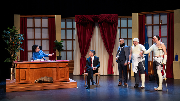 Sve apsurdnije činjenice i sve fantastičniji i zapetljaniji narativ ukazuju na to da imamo posla s potpuno izmišljenom stvarnošću. Tome se pridružuju i sve ekstravagantniji fizički obračuni sugovornika, iskorišteni kao video-intermezza koja su osmislili Nikola Čikos (animacija) i Mak Vejzović (video projekcije), a muzički obogatio Matija Antolić. U uredima ministri, šefovi i referenti piju, jedu i spavaju. Sve viši dužnosnici sve su neupućeniji, a naizgled sve detaljniji u istrazi slučaja pred kojim se nalaze. Napreduju i slapstick-sredstva; umjesto šakama (referenti) i stolcima (šef), ministar udara veslom, a potpredsjednica stijegom.