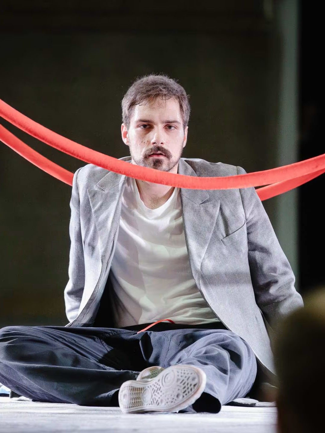 Mladi glumac Ivan Grlić, zapravo student ADU-a kojemu je ovo prva uloga na daskama HNK-a a i stipendist je Drame Hrvatskoga narodnog kazališta u Zagrebu, gotovo cijelo vrijeme predstave ludilo pokazuje (pretpostavljamo) time što trči u mjestu na sredini scene. Prethodno mu za jednu ruku selotejpom zalijepe jednu, veću sjekiru, a za drugu ruku drugu, manju sjekiru (zašto su dvije osim zbog ravnoteže?). Simbolika sjekire raznolika je, a svodi se na: simbol rata, simbol rušilaštva, simbol srdžbe, oruđe za žrtvovanje, simbol oluje i munje, oružje je grmljavine, emblem snage, simbol oštroumnosti, oruđe oslobađanja, što se ništa u predstavi ne vidi. Jedino što se tim trčanjem pokazuje Grlićeva je iznimna aerobna izdržljivost i koncentracija, kao i slušanje redateljskih zahtjeva, ali to nije pokazivanje kazališnoga umijeća nego iscrpljivanje mladoga čovjeka (iako on unatoč velikome naporu gotovo ne mijenja svoj tjelesni izgled, za razliku od Raskoljnikova koji naizgled propada, što je isto upitno). Stalno trčanje uz nužno lagano gibanje tijela gotovo smeta tako statičnoj predstavi pa gledatelji moraju gledati u potiljak onih ispred sebe kako im se ne bi zavrtjelo u glavi ili sklopiti oči i slušati, jer tako je predstava i koncipirana, kao slušaonica dosta zanimljivih i raznolikih glasova. Prije performansa s trčanjem i sjekirama, kolege glumci za vrijeme čitanja određenih dijelova romana studenta (ne prava, nego glume) namještaju u određene pozicije, a on šuti i trpi postavljanje u zaleđene slike, kao što je i šutio i trpio posipanje brašnom koje bi trebalo predstavljati boju, prašinu, kreč, jer u romanu Raskoljnikov prolazi pokraj radnika u zgradi u kojoj živi lihvarica sa svojom sestrom, a brašno iz vrećice vadi i posipa ga drugi kolega glumac.
