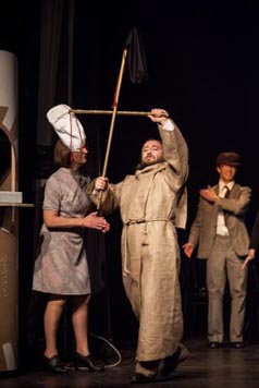 Još je impresivniji rad na osuvremenjivanju unutrašnjosti šatora koja je po Brechtovim zamislima trebala šokirati publiku kao na nekadašnjim vašarima slikama ili kipovima, a i primjercima u formalinu kao ilustracijom raspadanje tijela, dok Kovač stvara efektnu našu inačicu američkog spektakla koji kombinira propovijed i gospel i u kojem ovdje dominira njegov voditelj Karizmatik u iznimno sugestivnoj interpretaciji Nikše Marinovića koji je i skladatelj efektne glazbe koja također ima više dodirnih točaka s današnjom američkom scenskom glazbom no onom koju je koristio Brecht.
