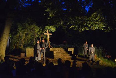 Dvorišni prostor na Krležinu Gvozu idealan je za ovo uprizorenje, radnja se odigrava na kamenim stepenicama, a jedini su elementi scenografije obješena lutka i raspelo s lutkom Isusa koji djeluju gotovo komično, svjetlo je fiksno, žuto, iz jednog pomičnog reflektora, no cjelokupna je atmosfera odlično uhvaćena. Ovom je prilikom spoj gavellijanskog nadahmuća, jednostavne estetike te stručnog vodstva kultnog redatelja s jedne te vrlo mlade generacije glumaca s druge strane, rezultirao vrlo dobrom, koherentnom i ujednačenom predstavom koja je u odabranom kontekstu imala priliku zaista zasjati.