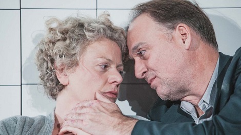 Predstava počinje scenom umiranja Katje, starije žene koju s odmakom, ali i mnogo nijansi uspjelo tumači Doris Šarić Kukuljica, posebno dojmljiva u tumačenju zanimljivog monologa o smrti i njenom dolasku. Iako se po tekstu čini da se to zbiva u domu za starije osobe, bijele pločice scenografije djeluju snažnije upućujući na mrtvačnicu. U njoj je ta žena na umoru (ili možda čak već mrtva) scenski potpuno uvjerljiva, dok Goran Guksić kao Bolničar (jedino emocionalno nehendikepirano lice) interesantnu ulogu ostvaruje pokazujući kako je teško na uobičajen način uspostaviti odnos prema stvarnosti koja se rasipa.