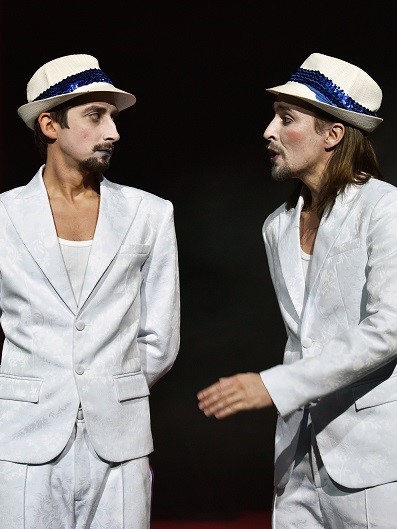 Petero glumaca (Urška Taufer, Peter Harl, Jure Kopušar, Matija Rupel, Žiga Udir), uz pijanista (Anže Vrabec/Joži Šalej) iznimno su ujednačeni, uigrani i komičarski zaigrani. Vidljivo je, od početka do kraja predstave, kako je igraju s lakoćom i opušteno, a opet ne površno ili bez reda i osjećaja za tempo i specifičnosti strukture. Slijedeći postavljene odnose pomaknutosti žanrovskih konvencija, glumci njima istovremeno ovladavaju (plešu, pjevaju, koriste se pokretom ili grimasom kao izražajnim sredstvom) i pomiču ih, obraćaju se publici, kreiraju nespretnosti na sceni i tako ostvaruju zabavljanje na više razina, ne samo onoj sadržajnoj.