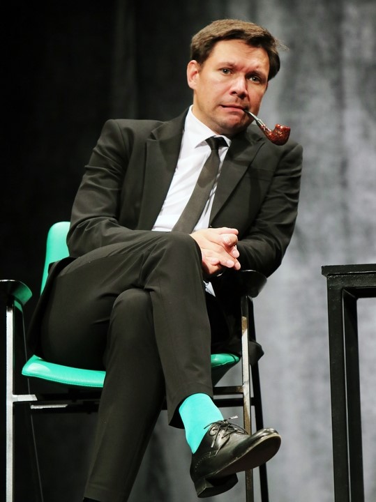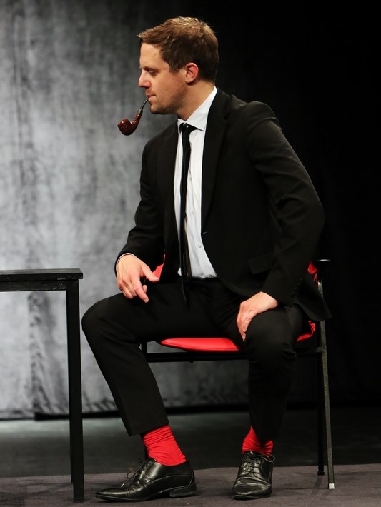 Odmak od te ozbiljnosti scenografkinja i kostimografkinja Anja Planinić naznačila je živim bojama čarapa i fotelja – zelenom za Marka Hergešića i crvenom za Filipa Detelića. Žive boje čarapa na tamnom odijelu često se koriste u klaunskom izričaju, a sramežljive naznake klaunerije bile su vidljive i u izvedbi dvojice glumaca i žao mi je da se taj bogati potencijal komičnog fizičkog teatra s njima nije više razradio te da se nisu više poigrali, kako naziv predstave govori, s Harmsom, odnosno s likovima koje spominju te samom izvedbom. Umjesto toga, Boris Kovačević, koji potpisuje i dramaturgiju, htio je ispričati što više priča te je glumce opteretio tekstom a ostavio im je premalo vremena za neverbalnu igru koja bi se, smatram, scenski sjajno slagala s Harmsovom komikom. Zahvaljujući njihovoj umješnoj i brzoj transformaciji tijela i glasa, međutim, pred publikom je prodefilirala galerija vrlo raznolikih likova prema kojima se, zbog naglašene karikaturalnosti, osjetio ironijski odmak samih pripovjedača. Pogrbljen i mrgudan stari je grobar, ukočen i zbunjen sveučilišni je profesor – to su samo dva, od mnogih primjera, a svaki je muški lik bio prikazan drugačije. Razlikovali su se prema hodu i načinu govora, neki od njih bili su prikazani s više a neki s manje humora. Nažalost, to se ne može reći za ženska lica koja su, iako ih nema mnogo, bila dočarana istom stereotipnom gestom i visokim tankim glasom bez ikakve razlikovne nijanse.