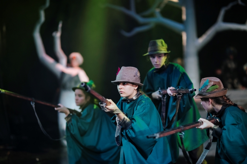 U oba su djela vrlo impresivni kostimi i raskošna scenografija, no ono što najviše plijeni pažnju jest izvedba mladih glumaca/plesača koji su jako uvjerljivi i sjajno igraju životinje te se glasaju i kreću baš poput njih. Pokret je tu, dakako, odigrao važnu ulogu. Svi su glumci usklađeni i odišu entuzijazmom dok igraju, što daje dodatni čar i predstavu diže na viši nivo.Odlično su razrađeni detalji u čitavoj predstavi koji joj daju notu posebnosti, čak i duhovitosti, a posebno je dojmljiv dio s lovcima koji stupaju u ritmu i plešu, te time prikazuju odlazak u lov. Pripovjedač, kojeg ne vidimo, podsjeća nas da je riječ o bajci a s obzirom na to da pripovijeda u rimi, time je čitava priča lijepo zaokružena. Glazba nije pretenciozna, prati radnju i emocije likova, no efektna je i naglašava svaki pokret na sceni.