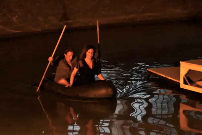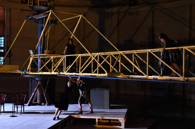Drugi dio predstave odvija se ispred ulaza u građevinu bazena, na prostoru s kojeg je unutrašnjost zgrade vidljiva kroz otvorena vrata, a uokolo se nalaze podrtine čamaca kakvi su se koristili za testiranja u bazenu (također uspjelo scenografsko rješenje), dok je okolno raslinje ostavljeno u zatečenom, podivljalom stanju visoke trave i drveća otetoga kontroli. Tu se ono što je ranije viđeno u zbijenoj koreodramskoj formi uglavnom lišenoj riječi odvija ponovno, u klasičnom dramskom tkivu i obliku kakav bi se mogao igrati na bilo kojoj komornoj pozornici. Konstanta obje scene ipak je bunar, mjesto koje u drami funkcionira doslovno ali i metaforički kao grotlo zločina, pad u ponor iz kojeg povratka nema, ali ne radi usuda, nego ljudske naravi.