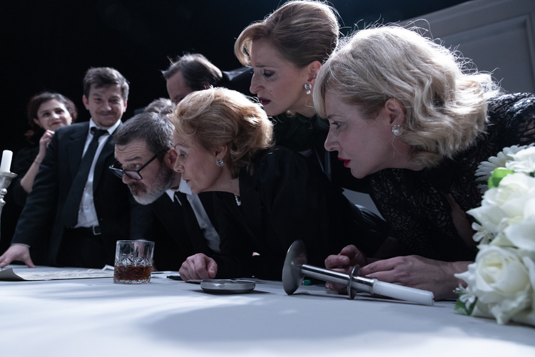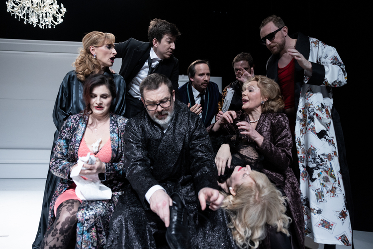 Scenografija je hladna i neutralna (Paola Lugarić), poput grobnice bogate pokojnikove kuće oko koje se rodbina otima, ali prilagođena prostoru hladne groteske uvijek istih situacija karikaturalne pohlepe i proračunatosti, koju je odlični glumački ansambl vrlo točno, predano i s puno zanimljivih kreacija utjelovio.