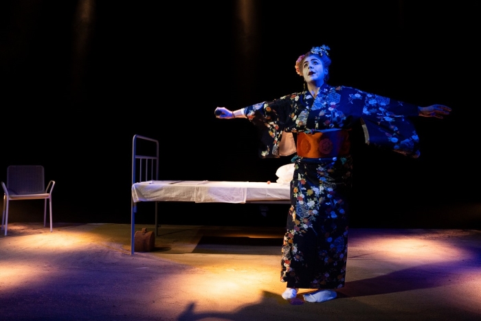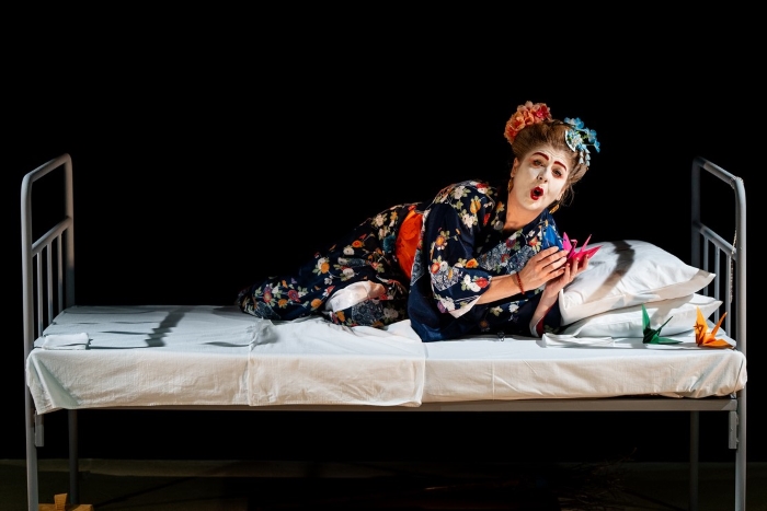 Prostor igre sužen je bijelim podom, možda točnije bijelim tatamijem koji „upija“ korake i zadani je okvir, reklo bi se, ovozemaljskog. Pažljivo je i znakovito odabran i izbor rekvizita kao i sjetne pa i pomalo turobne glazbene kulise sudbinskih odbrojavajućih tonova Žarka Dragojevića. Redatelj Paolo Tišljarić suptilno, dosluhno odabranom dramaturškom konceptu, niže poetske slike u kojima je u prvom planu glumačka osobnost Srđane Šimunović, ostavljajući joj dovoljno povoda i prostora da do kraja artikulira i odigra zamišljene epizode svojih elegičnih i nostalgičnih snovoplova. Komorni prostor Teatra Bursa krasi jednostavna, likovno čista i funkcionalna scenografija. Jedan prazni bolnički krevet s bijelom posteljinom i s nekoliko raznobojnih origami ždralova i ne slučajno pored jastuka. Svaki, pažljivo birani rekvizit simboličnih je priziva i u rukama glumice ritualno svjedoči i podsjeća kao neki melankolični pa i nostalgični i poetični zagovor onom čega više nema, svemu odlazećem i uspomenama.