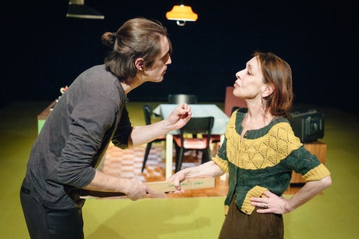 U glavnoj ženskoj ulozi ponovno briljira Doris Šarić Kukuljica koja se gotovo potpuno predaje dokumentarističkome diskursu, ogoljujući habitus, bez imalo šmire, šminke i manirizma u neposrednome kontaktu s publikom. Scena je još više sužena nego što to relativno mali prostor Polaneca zahtijeva: u sredini je kocka života koja pulsira, kuhinja u kojoj se susreću članovi obitelji i iz koje povremeno ulaze u nove kocke iza kulisa, kroz jedna i/ili druga, dijagonalno postavljena vrata za publiku. Na sceni su naznake namještaja, čak konkretni dijelovi kuhinje u kojoj se zaista nekazališno može kuhati, prati, ručati, kao i fotelja, televizor i nepostojeći dijelovi namještaja na koje se samo duhovito upućuje, ali i sugerirajući prazninu nepostojanja (scenograf: Matija Blašković). U svim je kućnim promjenama od odlaska sina također obojen i nepostojeći zid kojim dočekuju sina i koji se njemu ne sviđa, kao i ništa što odgovara roditeljima, što se osjeća u pritajenoj i/ili jasno iskaznoj tenziji i netrpeljivosti. Novi je zid u publici, negdje iza gledateljstva, kao četvrti zid kroz koji dalje na mogu proći i kroz koji se ne može izići. Publika postaje sastavni dio predstave već na početku, kad u nju izravno gledaju glumci, pjevajući pjesmu o umiranju i gotovo koketirajući s njom.