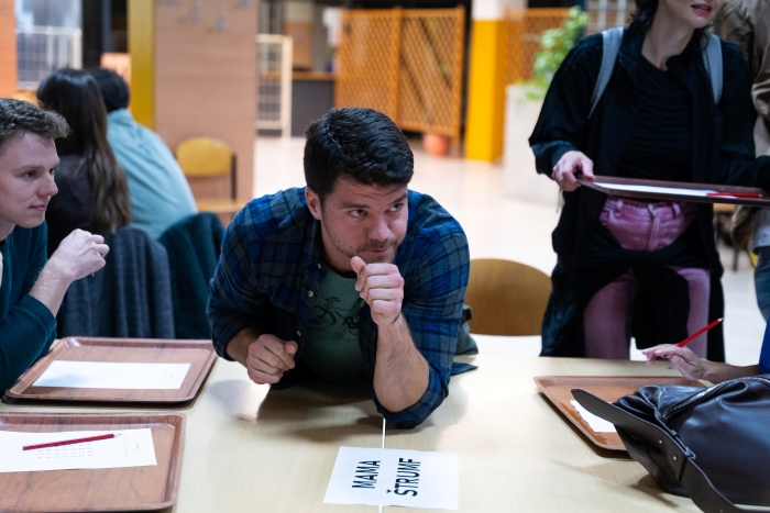 „Ne samo da se više ne znam boriti, nego ni pobjeći ne umijem kako valja“, piše Antun Šoljan u svome romanu Obiteljska večera kojim sam se studiozno bavila za svoj diplomski rad na Filozofskome fakultetu pišući o stilističkoj analizi i uživajući u Šoljanovim jezičnim ludičnostima i bravurama. Diplomski sam branila pred skupinom studenata jer je profesor mislio da svi trebaju čuti moje ideje, a ja sam odmah pristala ne razmišljajući o mogućemu stresu, a i bilo je prekasno za odbijanje. Sjetila sam se toga vozeći na novu premijeru, kao i mnogih antologijskih predstava u &TD-u koje su nas obilježile, Šoljanovih i Slamnigovih briljantnih prijevoda… U zadnje se vrijeme ne očekuje previše od predstava, ali žar ipak tinja. Skupljamo se, vode nas do studentske menze, sa svim mirisima (nismo se kao studentice nikad hranile u menzi, ali mirisi su mi dobro poznati), uzimamo poslužavnike s papirićem (a jedan će se papirić poslije zbog drugih razloga naći iza našega brisača) i olovkom i kratki izlet SC-om može početi. Postmodernistički i aktualno sjedamo za stolove i igramo kviz o Šoljanu i njegovu djelu, uz posebne upute. Svaka skupina – mi smo Ciceroni, ima svoga glumca, a ova je prva postaja isprepletena unutarnjim monolozima.
