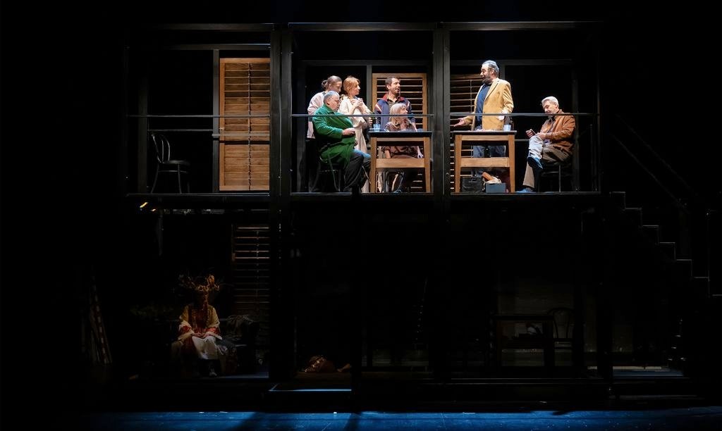 Scenograf Matija Blašković zanimljivo je kreirao scenu koja se kreće i okreće, stambenu zgradu u kojoj su vidljivi stanovi koji se približavaju i udaljuju, filmski se zumira večera u roditeljskoj kući u kojoj je i sestra i kći koju glumi već dobro profilirana, iako vrlo mlada Lana Meniga, primjer druge generacije drskih djevojaka koje ne prihvaćaju tradicionalni odgoj i brak, kao i spavaća soba novih supružnika, njihov dnevni boravak, stanovi susjeda: Đorđe Kukuljica, Siniša Ružić, Ivana Bolanča, Ivan Simon, koji proviruju iz svojih prozora i vrata, čak su u jednome trenutku svi na večeri, iako različiti profesionalno i izobrazbeno, čime se također licemjerno potencira nerazumijevanje. Jedina koja donekle komunicira s novonastanjenim bračnim parom je izvrsna, uvijek aktivna i atraktivna Barbara Nola koja se jedina zabrinjava kad čuje viku, lomljenje, udarce, hrabro dolazi ispred njihovih vrata, traži razgovor s najranjivijom ženom, procjenjuje situaciju, ali na kraju nedovoljno podržana, ne uspijeva ući kroz problematična vrata obiteljskoga, rodnouvjetovanoga nasilja.