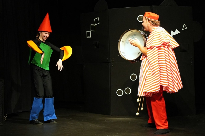 Osim udaraljki koje obuhvaćaju i dječji instrumentarij, predstava koristi trokrilni paravan (Emili Tomaić) na sredini pozornice za kazalište predmeta od geometrijskih oblika (likova) i sijalica. Odvija se ritimično gibanje predmeta: izvođač izvodi ritam, a sijalice, oblici ili čovjek (dijelovi tijela) se pokreću. Međutim, izvođač kao da nije sasvim uvjeren u to što radi ni što se događa, te nastupa s nejasnoćom koja je za izvođača općenito nedopustiva. Posebno je nedopustiva ako se pokušava ostvariti kontakt s djecom, kao što ova predstava u teoriji pokušava, jer se dječju publiku ne može prevariti. Njihova pažnja nije konvencionalna pažnja gledatelja koji će s pristojnom nezainteresiranošću otrpjeti predstavu.