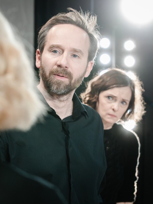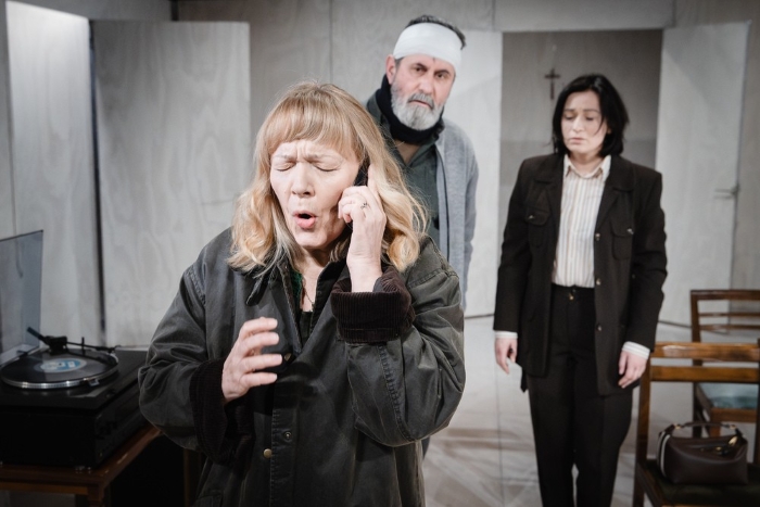 Dva dijela predstave povezuju i ženske uloge. U prvome je dijelu izvrsna Branka Trlin kao Slavica. Dugo je nismo vidjeli u tako izvrsnoj ulozi supruge i majke kojoj Matišić oduzima sluh i glas, a onda joj ih vraća i ona progovara vlaški jer je On tako htio. Izvrsno se kreće, duhovita je, poslije prelazi na zagrebački idiom, komunicira s Njim i osuđuje muža kad se sazna za njegovu tajnu, skupa s kćeri Anom u interpretaciji Mirele Videk Hranjec, liječnice s odjela traumatologije „koja se i na poslu i kod kuće bavi povredama i ranama koje nikada neće zarasti“ i koja se dobro snalazi među glumačkim veličinama. U drugome su dijelu također dvije žene, koje su i supruge i majke, s teškim i dubokim tugama, koje žive zahvaljujući lijekovima i odlascima na groblje, pandani svojih muževa, obje izvrsne: Ines Bojanić dugo nismo vidjeli u tako dobroj ulozi, igra pokajnicu Anu tužno ali vrlo uvjerljivo, kao i Linda Begonja, Marija, kontrolirana, dijelom povučena, potpora mužu, sa stalnom beckettovskom torbom u kojoj je projektor. Obje čupaju zube u svojim nezamislivim tragedijama, dok počinje kiša koja dodatno otvara tuge. Izvrsna ih režija postavlja u zanimljive šahovske suodnose, mizanscenski dijagonalno, udaljeno ili intimno, precizno i mudro.